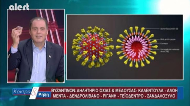 Για να καταλάβετε φίλοι, ο κορωνοϊός είναι ένα θέμα, οι ιώσεις Η1Ν1 κλπ Με τη Βυζαντινόν αποτρέπετε κάθε μικρόβιο από τα χέρια σας. Δεν θα έχετε μικρόβια. Είναι αντισηπτικό, δρα εναντίον των λοιμώξεων, και κυρίως των μολύνσεων. Μία επάλειψη θα κάνετε το πρωί, μια το μεσημέρι και μια το βράδυ και κάντε 17 χειραψίες. Δεν κολλάτε τίποτα»…