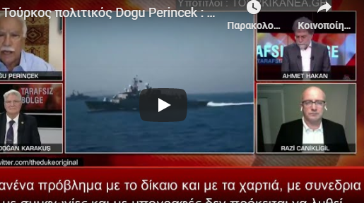Απορρίπτοντας τα σενάρια διαλόγου ανάμεσα σε Ελλάδα και Τουρκία, ο Ντογού Περιντσέκ, παλαίμαχος πολιτικός του κόμματος Vatan, σε παρέμβασή του στο CNN Turk και με παραληρηματικό λόγο, είπε: