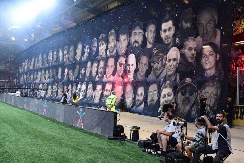Την ίδια στιγμή, δε, ο αετός Οδυσσέας πετούσε μέσα στον αγωνιστικό χώρο, μεταφέροντας την μπάλα μέσα σε αποθέωση, για την έναρξη του αγώνα, ενώ στο πέταλο των οργανωμένων ανέβηκε ένα τεράστιο πανό, με οπαδούς της ΑΕΚ, που έχουν φύγει από τη ζωή.