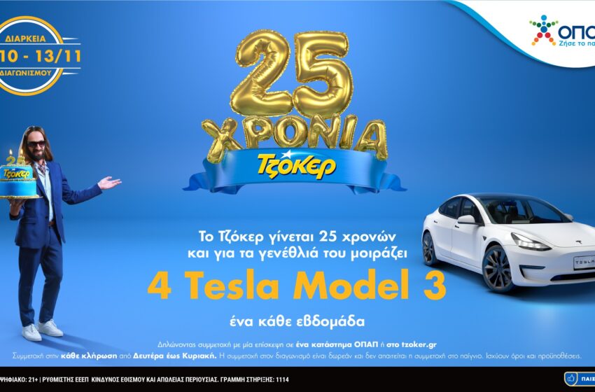 Το ΤΖΟΚΕΡ γίνεται 25 χρόνων και γιορτάζει τα γενέθλιά του μοιράζοντας 4 αυτοκίνητα TESLA Model 3. Από τις 17 Οκτωβρίου έως και τις 13 Νοεμβρίου, 4 τυχεροί θα κερδίσουν από ένα αυτοκίνητο, σε 4 συνεχόμενες εβδομαδιαίες κληρώσεις. Για να συμμετάσχει κάποιος στην κλήρωση, το μόνο που χρειάζεται να κάνει είναι να επισκεφθεί ένα κατάστημα ΟΠΑΠ ή την ιστοσελίδα tzoker.gr. Η συμμετοχή στις εβδομαδιαίες κληρώσεις γίνεται εντελώς δωρεάν, αφού δεν απαιτείται να παίξει κάποιος ΤΖΟΚΕΡ ή οποιοδήποτε άλλο παιχνίδι προκειμένου να πάρει μέρος.