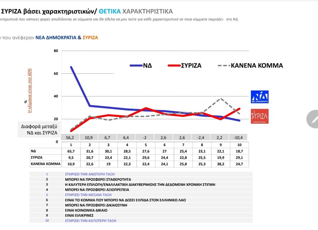Η Ν.Δ είναι πολύ ισχυρή ως προς το ότι: στηρίζει την ανώτερη τάξη (κατά 65,7% έναντι 9,5% της αξιωματικής αντιπολίτευσης), μπορεί να προσφέρει σταθερότητα, θεωρείται η καλύτερη επιλογή/εναλλακτική διακυβέρνησης την δεδομένη χρονική στιγμή και μπορεί να προσφέρει αξιοπρέπεια.