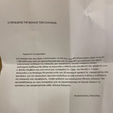Πιο αναλυτικά, ο Πρόεδρος της Βουλής κ. Τασούλας φερόταν να προτρέπει βουλευτές να του υποβάλουν αιτήματα για χρήματα σε επιχορηγήσεις σε συλλόγους της εκλογικής τους περιφέρειας καθώς, παρά το γεγονός ότι ο ίδιος ο Πρόεδρος έχει δήθεν διαθέσει ένα εκατομμύριο ευρώ σε συλλόγους των Ιωαννίνων, έχουν περισσέψει διαθέσιμα.