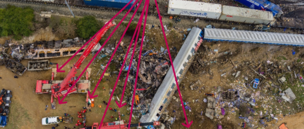 Από τα ίχνη κίνησης του γερανού στο σημείο, διαπιστώνεται ότι αυτός μετακινήθηκε από το αρχικό σημείο αρχικής του θέσης του με τις βαθμίδες στήριξης πέδιλων και χωρίς ανάγκη παρουσίας χαλικιών(!!!), όχι για τις διαδικασίες διάσωσης ή ανάσυρσης θυμάτων , αλλά προφανώς για να υποστηρίξει την αφαίρεση αντικειμένου (εκ των υστέρων) κάτω από το επιβατηγό βαγόνι.