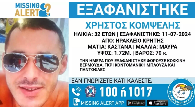 Το «Χαμόγελο του Παιδιού» ενημερώθηκε για την εξαφάνιση του 32χρονου Χρήστου Κομψέλη στο Ηράκλειο Κρήτης χθες, 22/07/2024, και προχώρησε στη δημοσιοποίηση των στοιχείων του ενήλικα κατόπιν αιτήματος της οικογένειας του και ενημέρωσης της Εισαγγελίας, καθώς ενδέχεται να συντρέχουν λόγοι οι οποίοι θέτουν τη ζωή του σε κίνδυνο.