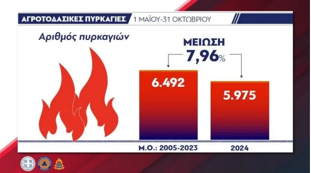 Όπως βλέπετε εδώ, παρατηρείται μείωση κατά 8% περίπου του αριθμού των πυρκαγιών σε σχέση με τα δεδομένα της 20ετίας: 6.492 είναι ο Μέσος Όρος κατά την αντιπυρική περίοδο και 5.975 πυρκαγιές αντίστοιχα το 2024.