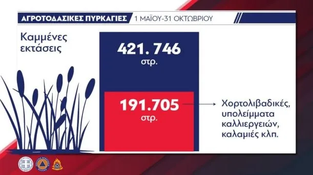 Από τα 421.476 στρέμματα καμένων εκτάσεων, το 45% δηλαδή, 191.000 στρέμματα είναι χορτολιβαδικές, υπολείμματα, καλαμιές κλπ. Έτσι εξηγούνται, λοιπόν, και οι πολύ μεγάλες μειώσεις καμένων δασών και δασικών εκτάσεων που είδαμε προηγούμενα σε σχέση με το συνολικό αριθμό στρεμμάτων.