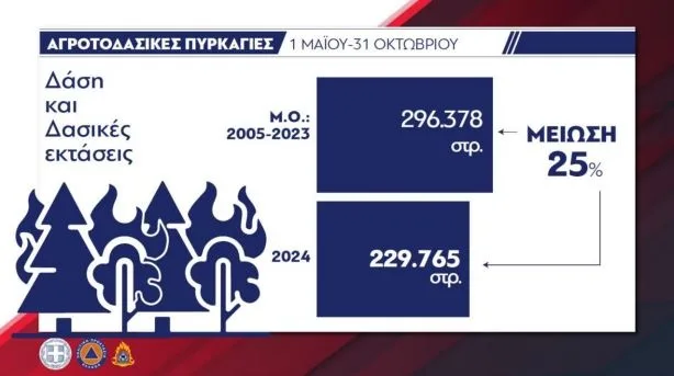 Από την 1η Ιανουαρίου έως και τις 31 Οκτωβρίου είχαμε αύξηση κατά 7,42% του αριθμού των πυρκαγιών σε σχέση με τον Μέσο Όρο 20ετίας: 8.844 πυρκαγιές είναι ο ΜΟ, και 9.500 το 2024.