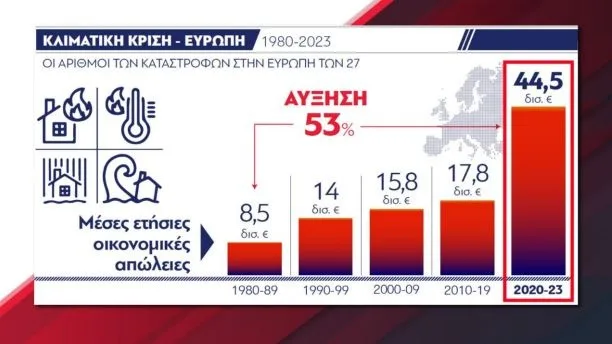 Τα τελευταία 45 χρόνια στην Ευρώπη των 27, έχασαν τη ζωή τους λόγω φυσικών καταστροφών 241.587 άνθρωποι, ενώ το κόστος των ζημιών ανήλθε σε 738 δις 280 εκατομμύρια ευρώ.