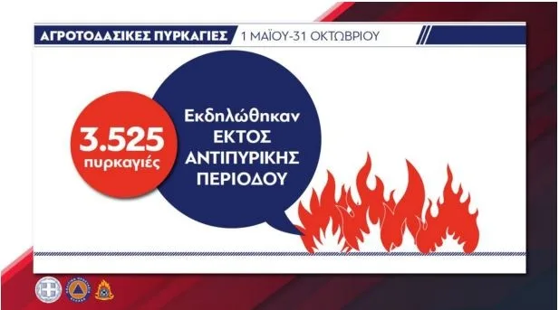 Εδώ θέλω να τονίσω, γιατί πολύ πιθανό να το αντιμετωπίζουμε πολύ πιο συχνά στο μέλλον, ένα ανησυχητικό γεγονός: Τον μεγάλο αριθμό πυρκαγιών εκτός αντιπυρικής περιόδου: Από τις 9.500 συνολικά πυρκαγιές του 2024 οι 3.525 εκδηλώθηκαν πριν ή μετά την αντιπυρική περίοδο με ό,τι αυτό συνεπάγεται.