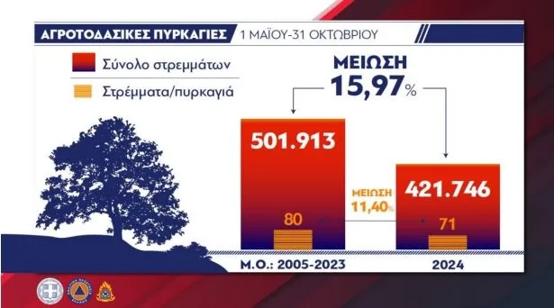 Συνολικά στην αντιπυρική περίοδο από 1η Μαΐου – 31 Οκτωβρίου εμφανίζεται μείωση κατά 15,97% όλων των ειδών των καμένων εκτάσεων: 500.000 στρέμματα είναι ο ΜΟ 20ετίας, 421.000 στρέμματα το 2024 και αντίστοιχα 80 και 71 στρέμματα ανά πυρκαγιά. Ωστόσο όπως θα δείτε αμέσως μετά…