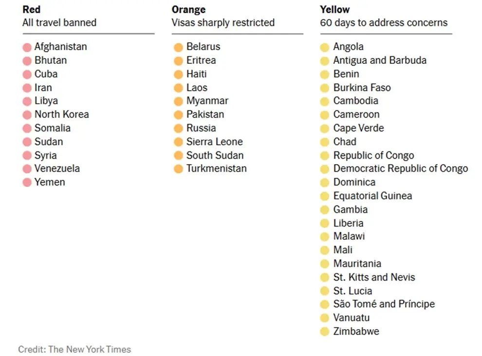 Ορισμένες από τις χώρες στη «κόκκινη» και «πορτοκαλί» λίστα είχαν υποστεί κυρώσεις από τον Τραμπ κατά τη διάρκεια των ταξιδιωτικών απαγορεύσεων της πρώτης θητείας του, αλλά πολλές είναι αυτές που έχουν προστεθεί. Ορισμένες μοιράζονται κοινά χαρακτηριστικά με τις προηγούμενες λίστες Τραμπ και γενικά πρόκειται για χώρες με μουσουλμανική πλειοψηφία ή άλλες μη λευκές, φτωχές και με κυβερνήσεις που θεωρούνται αδύναμες ή διεφθαρμένες.