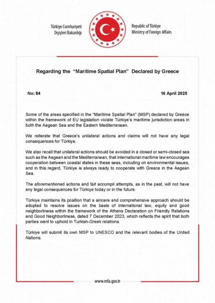 Νωρίτερα το τουρκικό ΥΠΕΞ στην επίσημη ανακοίνωσή του χαρακτηρίζει μονομερείς τις ενέργειες της Αθήνας για τον Θαλάσσιο Χωροταξικό Σχεδιασμό, ωστόσο, δηλώνει ανοικτή σε διάλογο. Παράλληλα αναφέρει πως «απόπειρες τετελεσμένων, όπως και στο παρελθόν, δεν θα έχουν καμία νομική συνέπεια για την Τουρκία σήμερα ή στο μέλλον», ενώ σημειώνει πως η Τουρκία «θα υποβάλει το δικό της ΘΧΣ στην UNESCO και στα αρμόδια όργανα των Ηνωμένων Εθνών».
