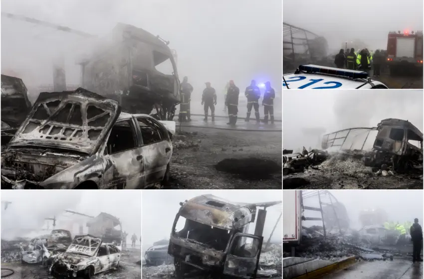Δύο νεκροί με φρικτό τρόπο, τέσσερις τραυματίες ο τραγικός απολογισμός του σοκαριστικού τροχαίου δυστυχήματος τη Μεγάλη Τρίτη στην Εγνατία Οδό, στην περιοχή της Κοζάνης. Νταλίκα και δύο αυτοκίνητα συγκρούστηκαν και τυλίχτηκαν στις φλόγες ενώ το κουβούκλιο των διοδίων διαλύθηκε.