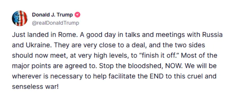 Σε ανάρτησή του στην πλατφόρμα Truth Social ο Αμερικανός πρόεδρος Ντόναλντ Τραμπ αναφέρει: «Μόλις προσγειώθηκα στη Ρώμη. Μια καλή μέρα σε συνομιλίες και συναντήσεις με τη Ρωσία και την Ουκρανία. Είναι πολύ κοντά σε μια συμφωνία και οι δύο πλευρές θα πρέπει τώρα να έχουν συνάντηση υψηλού επιπέδου για να την ολοκληρώσουν. Τα περισσότερα από τα βασικά σημεία έχουν συμφωνηθεί. Σταματήστε την αιματοχυσία, ΤΩΡΑ. Θα είμαστε όπου χρειαστεί για να συμβάλλουμε στο ΤΕΛΟΣ αυτού του σκληρού και παράλογου πολέμου!».