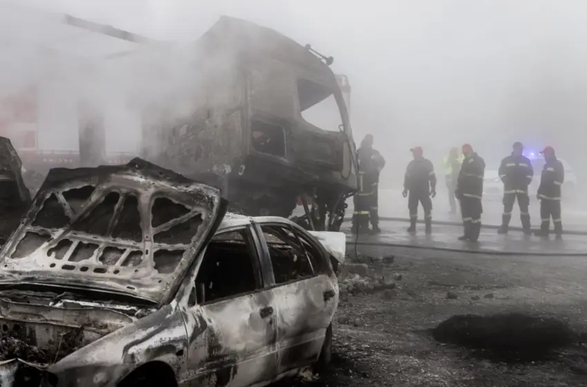 Οι δυο άνθρωποι που έχασαν τη ζωή τους επέβαιναν στο ΙΧ που βρισκόταν ακριβώς μπροστά στο κουβούκλιο των διοδίων όταν έπεσε επάνω τους το φορτηγό, μέσα σε συνθήκες πυκνής ομίχλης, για να τυλιχτούν αμέσως στις φλόγες.