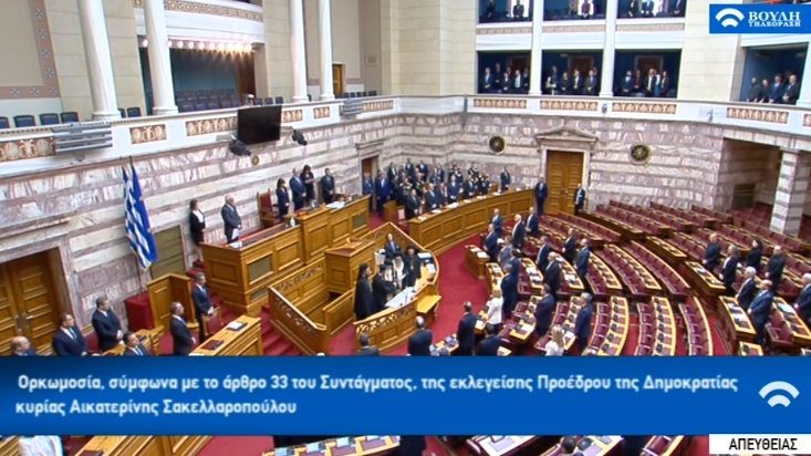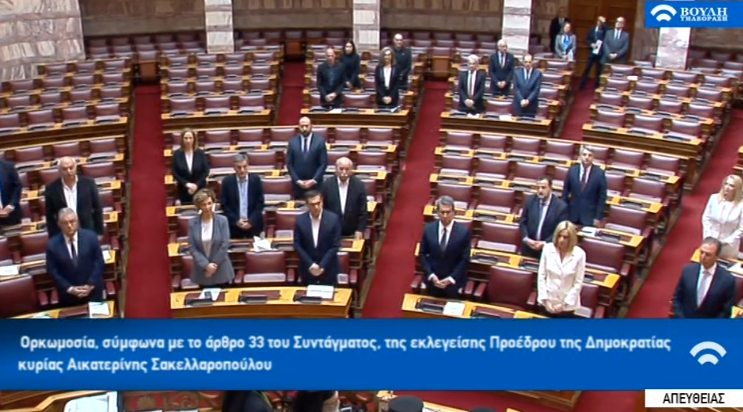Άδεια τα έδρανα στη Βουλή κατά την ορκωμοσία της νέας Προέδρου της Δημοκρατίας Κατερίνας Σακελλαροπούλου, λόγω των μέτρων για τον κοροναϊό.