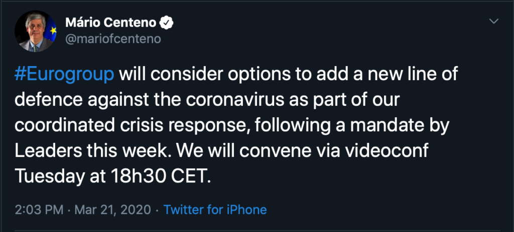 “Το Eurogroup θα εξετάσει επιλογές για την προσθήκη νέας γραμμής άμυνας κατά του κορονοϊού ως μέρος της συντονισμένης αντιμετώπισης της κρίσης, μετά από εντολή των ηγετών την περασμένη εβδδομάδα”