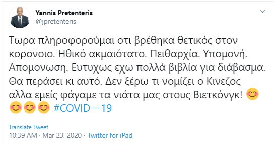 Θετικός στον κοροναϊό ο Γιάννης Πρετεντέρης Media Ειδήσεις Η Συντακτική ομάδα του Libre 23 Μαρτίου, 2020 Share Tweet Email Ο δημοσιογράφος Γιάννης Πρετεντέρης βρέθηκε θετικός στον κοροναϊό, όπως έκανε γνωστό ο ίδιος μέσα από ανάρτησή του στο Twitter.