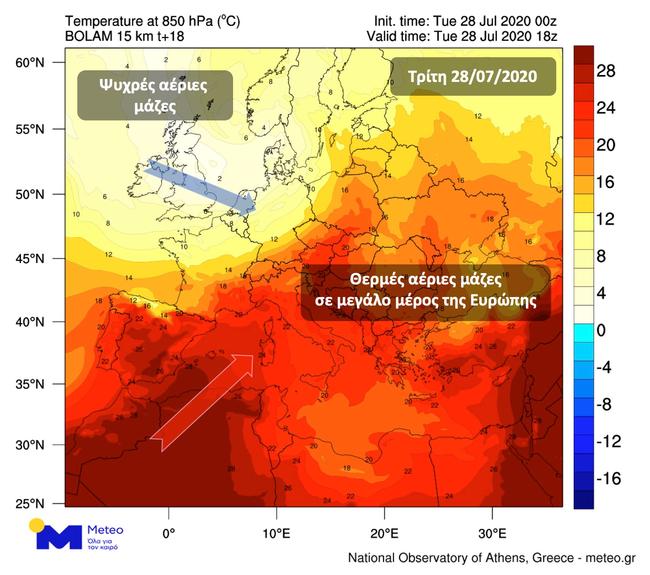 Αντίθετα στη Βορειοδυτική Ευρώπη, ψυχρές αέριες μάζες κινούνται γρήγορα ανατολικά και θα οδηγήσουν σε έντονα καιρικά φαινόμενα στην Κεντρική και Ανατολική Ευρώπη την Τρίτη 28 και την Τετάρτη 29 Ιουλίου.