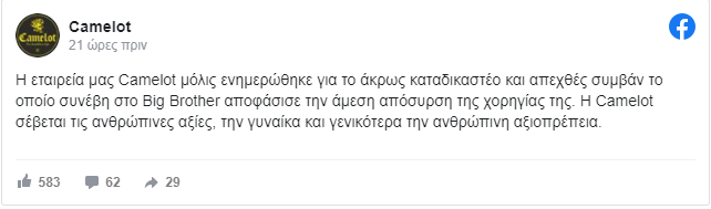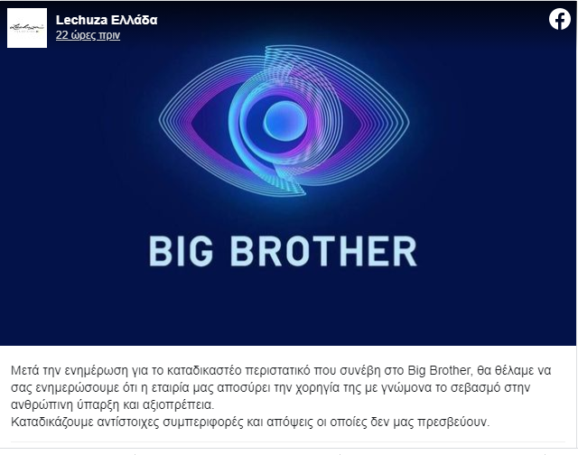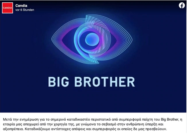 «Μετά την ενημέρωση για το σημερινό καταδικαστέο περιστατικό από συμπεριφορά παίχτη του Big Brother, η εταιρία μας αποχωρεί από την χορηγία της, με γνώμονα το σεβασμό στην ανθρώπινη ύπαρξη και αξιοπρέπεια. Καταδικάζουμε αντίστοιχες απόψεις και συμπεριφορές οι οποίες δε μας πρεσβεύουν», τονίζει η εταιρεία στρωμάτων Candia.