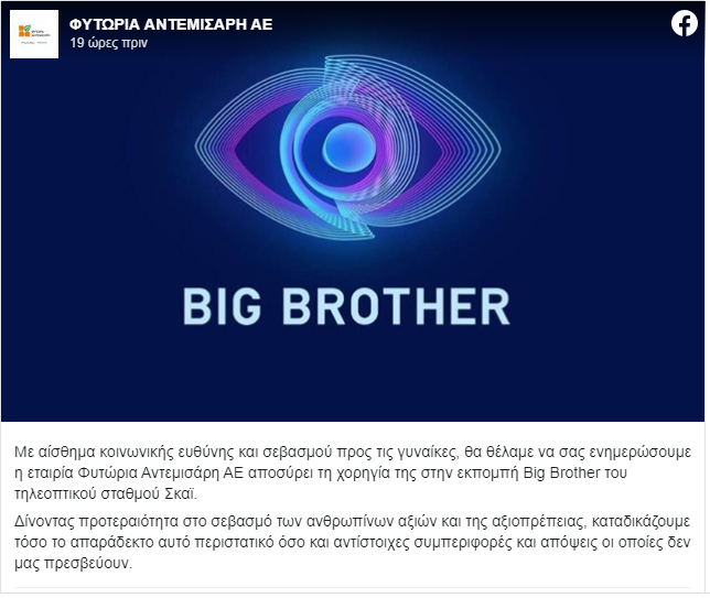 «Με αίσθημα κοινωνικής ευθύνης και σεβασμού προς τις γυναίκες, θα θέλαμε να σας ενημερώσουμε η εταιρεία Φυτώρια Αντεμισάρη ΑΕ αποσύρει τη χορηγία της στην εκπομπή Big Brother του τηλεοπτικού σταθμού Σκαϊ. Δίνοντας προτεραιότητα στο σεβασμό των ανθρωπίνων αξιών και της αξιοπρέπειας, καταδικάζουμε τόσο το απαράδεκτο αυτό περιστατικό όσο και αντίστοιχες συμπεριφορές και απόψεις οι οποίες δεν μας πρεσβεύουν», αναφέρει η ανακοίνωση από τα ΦΥΤΩΡΙΑ ΑΝΤΕΜΙΣΑΡΗ ΑΕ.