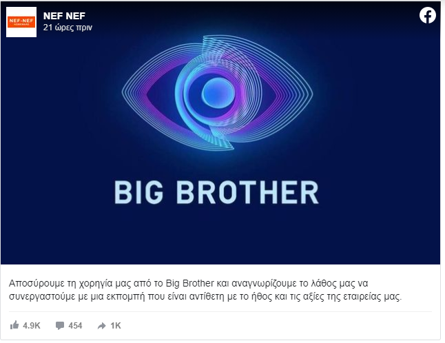 «Αποσύρουμε τη χορηγία μας από το Big Brother και αναγνωρίζουμε το λάθος μας να συνεργαστούμε με μια εκπομπή που είναι αντίθετη με το ήθος και τις αξίες της εταιρείας μας», αναφέρει σε ανακοίνωσή της η NEF NEF.