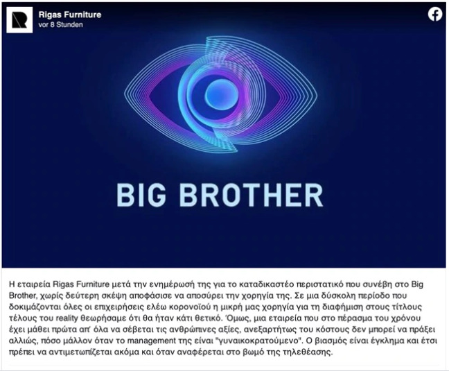 «Η εταιρεία Rigas Furniture μετά την ενημέρωσή της για το καταδικαστέο περιστατικό που συνέβη στο Big Brother, χωρίς δεύτερη σκέψη αποφάσισε να αποσύρει την χορηγία της. Σε μια δύσκολη περίοδο που δοκιμάζονται όλες οι επιχειρήσεις ελέω κορονοϊού η μικρή μας χορηγία για τη διαφήμιση στους τίτλους τέλους του reality θεωρήσαμε ότι θα ήταν κάτι θετικό. Όμως, μια εταιρεία που στο πέρασμα του χρόνου έχει μάθει πρώτα απ΄ όλα να σέβεται τις ανθρώπινες αξίες, ανεξαρτήτως του κόστους δεν μπορεί να πράξει αλλιώς, πόσο μάλλον όταν το management της είναι “γυναικοκρατούμενο”. Ο βιασμός είναι έγκλημα και έτσι πρέπει να αντιμετωπίζεται ακόμα και όταν αναφέρεται στο βωμό της τηλεθέασης» αναφέρει η Rigas Furniture.