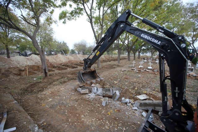 Λίγο πιο δίπλα συνεργεία του δήμου Θεσσαλονίκης πραγματοποιούν καθημερινά εργασίες, φορώντας ειδικές στολές έτσι ώστε να ανοίξουν νέοι ταφώνες και να καλυφθούν οι ανάγκες.