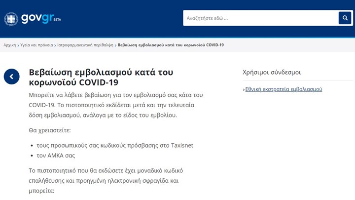 Η βεβαίωση εμβολιασμού κατά της νόσου COVID-19 είναι διαθέσιμη από την επόμενη ημέρα της δεύτερης δόσης του εμβολίου στην κατηγορία «Υγεία και Πρόνοια» και την υποκατηγορία «Ιατροφαρμακευτική περίθαλψη» του gov.gr.