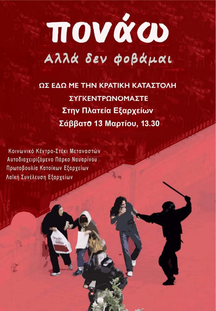 Το Σάββατο 13 και την Κυριακή 14 Μαρτίου οργανώσεις, λαϊκές συνελεύσεις και συλλογικότητες καλούν σε διαμαρτυρία ενάντια στην καταστολή για «να φωνάξουμε ένα μεγάλο «ως εδώ» και να διεκδικήσουμε την ελευθερία και τα δικαιώματά μας σε όλες τις γειτονιές».