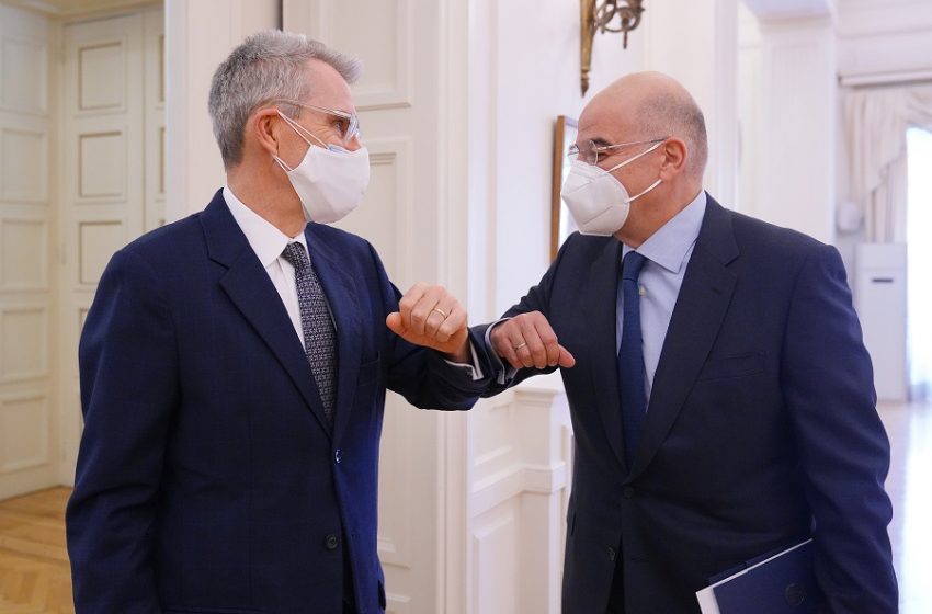 Με τον Τζέφρι Πάιατ συναντήθηκε σήμερα ο Νίκος Δένδιας αμέσως μετά την επιστροφή του από τη Βεγγάζη και λίγο πριν ταξιδέψει για την Άγκυρα προκειμένου να συναντηθεί αύριο με τον Μεβλούτ Τσαβούσογλου.