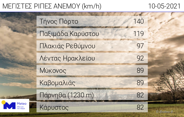 Σύμφωνα με το δίκτυο των αυτόματων μετεωρολογικών σταθμών του Εθνικού Αστεροσκοπείου Αθηνών/meteo.gr, επικράτησαν ισχυρότατες ριπές, με τη μεγαλύτερη εξ αυτών να φτάνει τα 140 χιλιόμετρα/ώρα το πρωί στο Πόρτο Τήνου, ενώ ακολούθησαν άνεμοι έως 119 χλμ./ώρα στην Παξιμάδα Καρύστου.