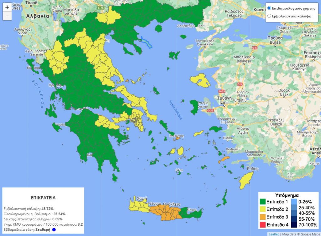 Το Ρέθυμνο, το Ηράκλειο, η Μύκονος, η Κως και η Σκιάθος, βρίσκονται στο πορτοκαλί επίπεδο ετοιμότητας στον επικαιροποιημένο επιδημιολογικό χάρτη της Ελλάδας για τον κοροναϊό.