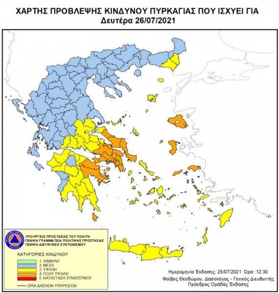 Σύμφωνα με το Χάρτη Πρόβλεψης Κινδύνου Πυρκαγιάς που εκδίδει η Γενική Γραμματεία Πολιτικής Προστασίας του Υπουργείου Προστασίας του Πολίτη για αύριο Δευτέρα 26 Ιουλίου, προβλέπεται πολύ υψηλός κίνδυνος πυρκαγιάς (κατηγορία κινδύνου 4) για τις εξής περιοχές: