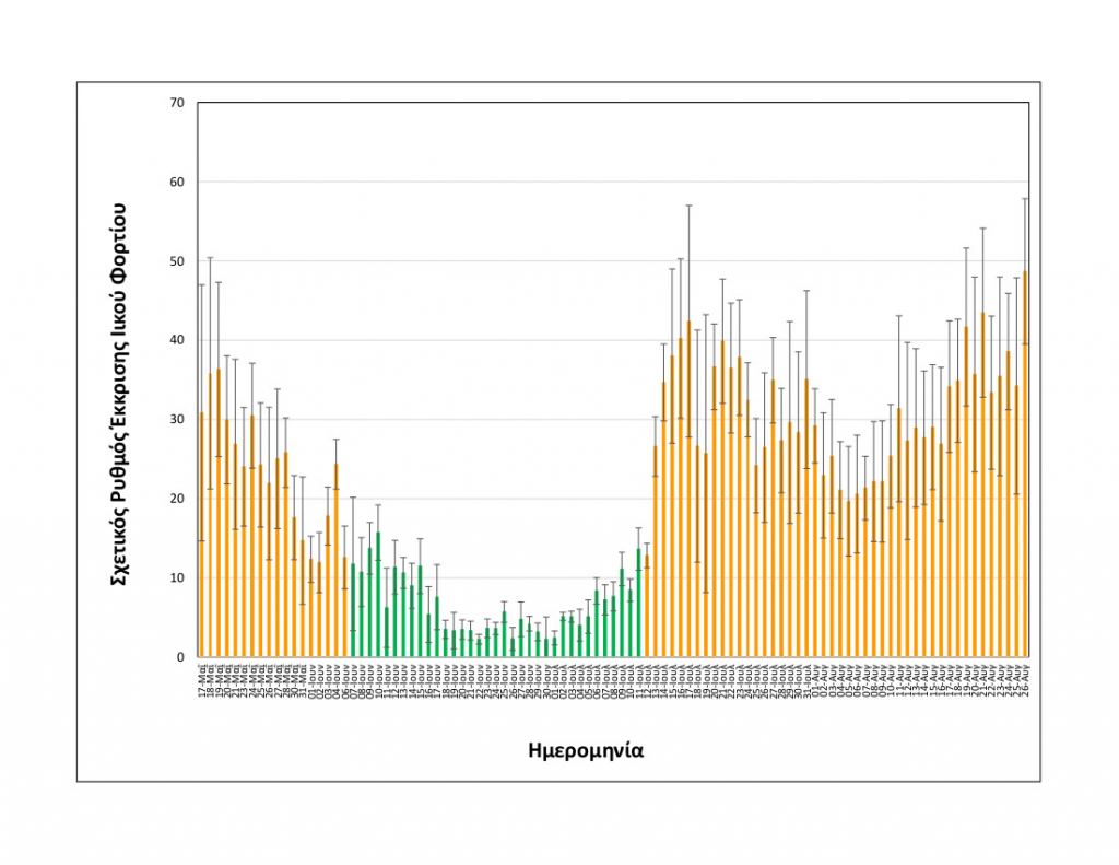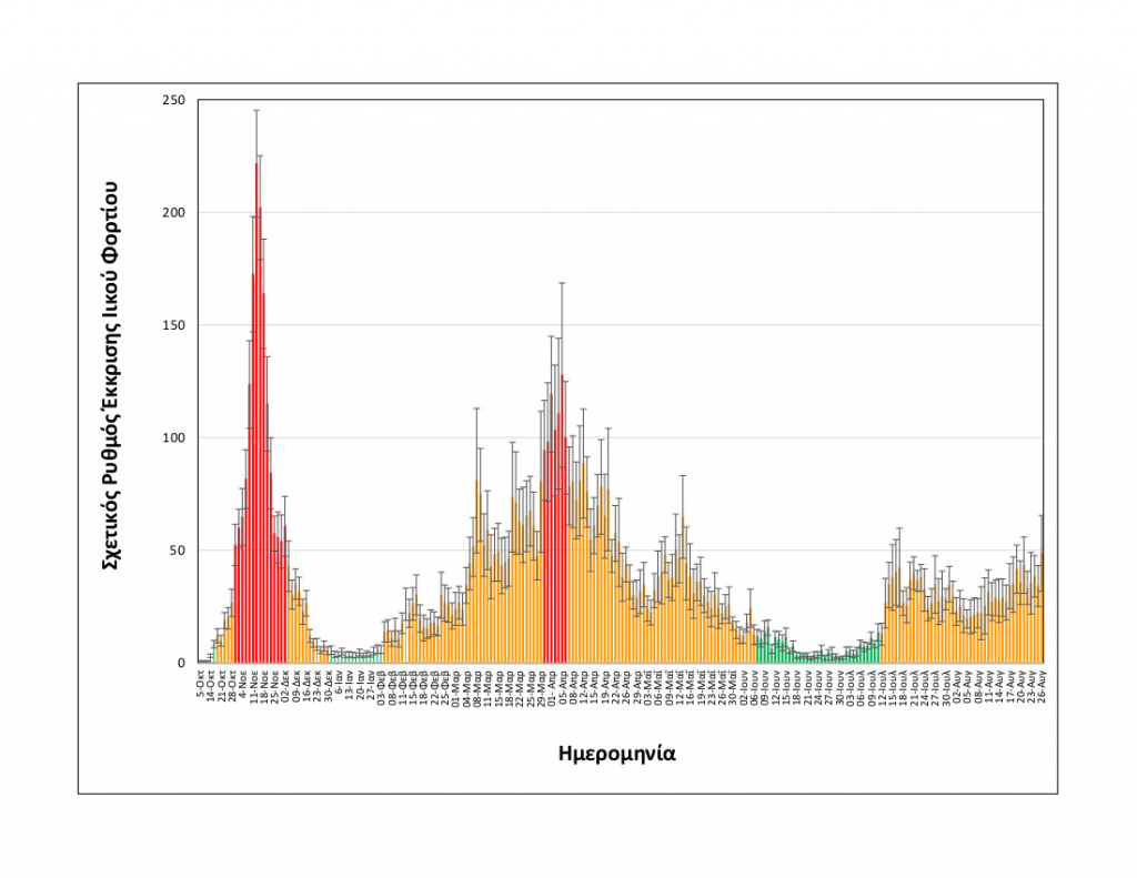 Όπως φαίνεται στα διαγράμματα, μετά το πρώτο δεκαήμερο του Αυγούστου όπου οι τιμές του ιικού φορτίου είχαν σταθεροποιηθεί σε χαμηλότερα επίπεδα, σταδιακά άρχισαν να αυξάνονται, ιδιαίτερα από τις 17 Αυγούστου και μετά. Πιο έντονες διακυμάνσεις εξακολουθούν να καταγράφονται ανάμεσα στις αναλύσεις που γίνονται τις καθημερινές και τα σαββατοκύριακα, κάτι που έχει αποδοθεί στην πληθυσμιακή αλλοίωση, που παρατηρείται τους θερινούς μήνες λόγω μετακινήσεων.