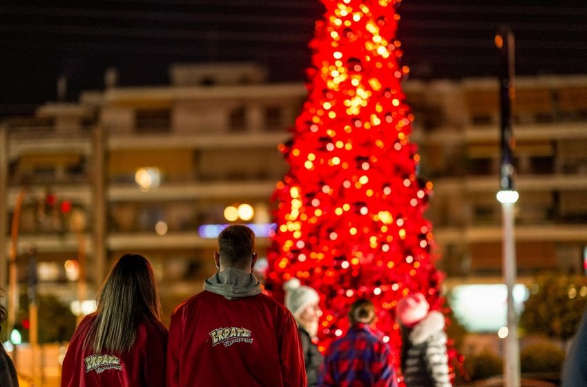 Χριστουγεννιάτικα κλικ κάτω από το κατακόκκινο δέντρο του ΣΚΡΑΤΣ στο Γαλάτσι – Εορταστικό χρώμα στην πλατεία Μανδηλαρά