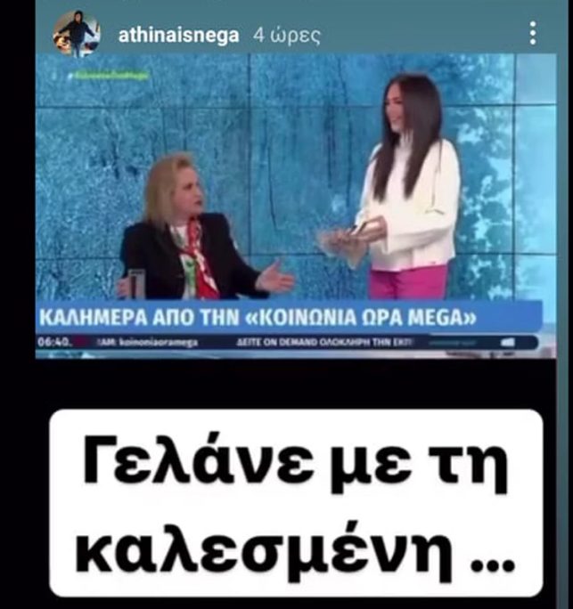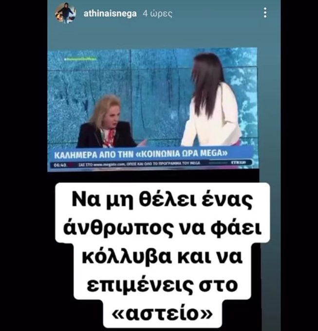 Την ενόχλησή της για την «πλάκα» της Ανθής Βούλγαρη στη Ματίνα Παγώνη με τα κόλλυβα, εξέφρασε η Αθηναΐς Νέγκα. Η ραδιοφωνική παραγωγός σχολίασε το περιστατικό μέσω stories στο Instagram.