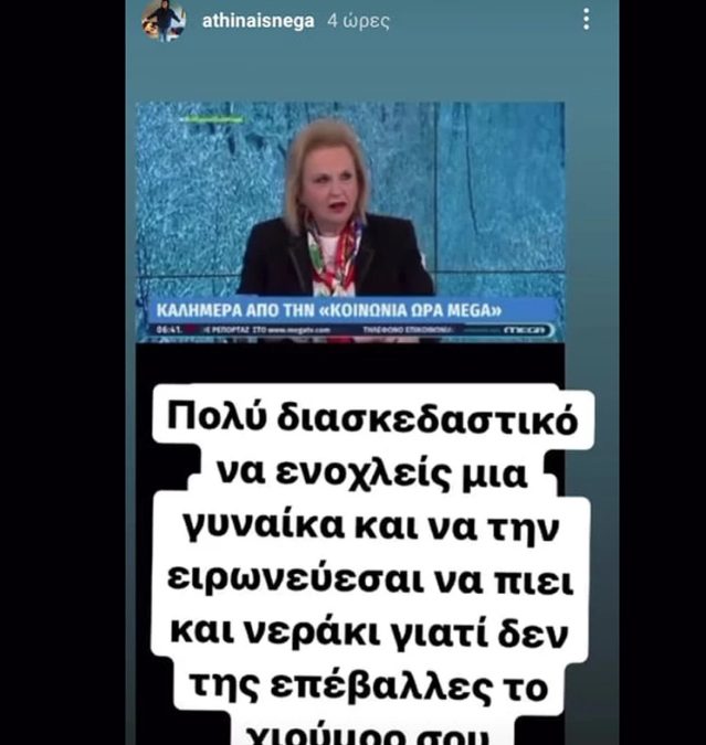 «Να μη θέλει ένας άνθρωπος να φάει κόλλυβα και να επιμένεις στο “αστείο”. Να επιμένεις και να πλησιάζεις. Και δεν είναι πως δεν έχει χιούμορ η κ. Παγώνη. Γελάνε με την καλεσμένη. Πολύ διασκεδαστικό να ενοχλείς μία γυναίκα και να την ειρωνεύεσαι να πιει νεράκι γιατί δεν της επέβαλες το χιούμορ σου».