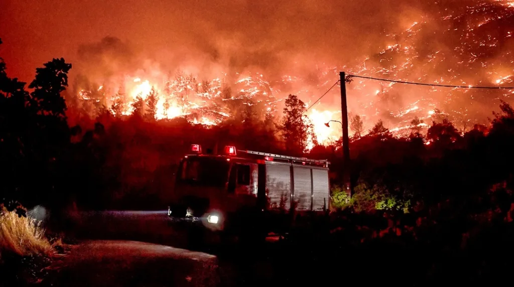 Η φωτιά αποτεφρώνει πευκοδάσος κοντά στο στρατόπεδο στις Κεχριές.