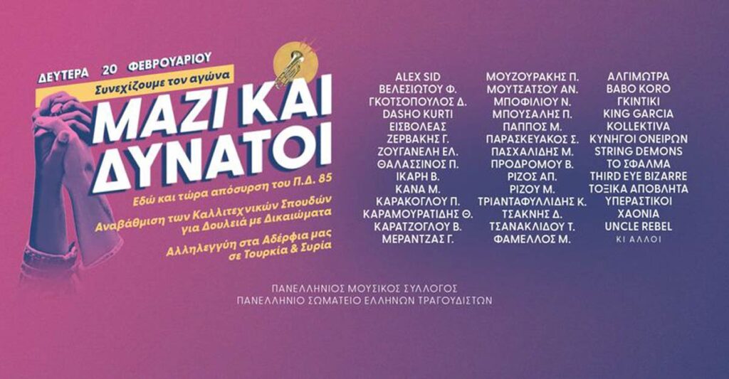 • Καλούμε τα καλλιτεχνικά σωματεία να συμμετέχουν μαζικά στις συνελεύσεις τους και να στηρίξουν πενθήμερες απεργιακές κινητοποιήσεις.