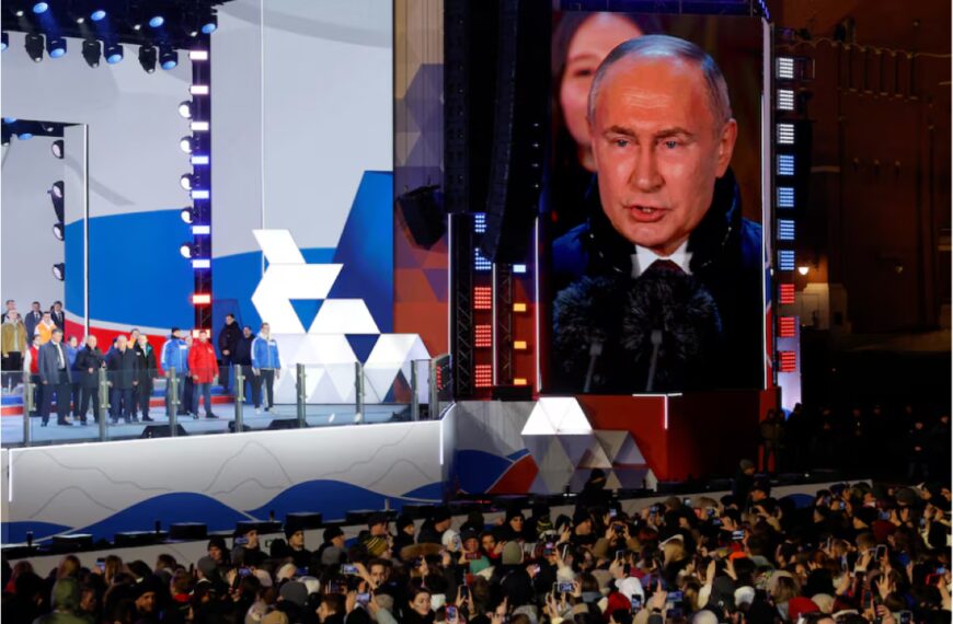 Μία ημέρα μετά την εξασφάλιση νέας εξαετούς θητείας, ο Ρώσος πρόεδρος Βλαντίμιρ Πούτιν εμφανίστηκε για λίγο σε υπαίθρια συναυλία στην Κόκκινη Πλατεία τη Δευτέρα με αφορμή τη 10η επέτειο της προσάρτησης της Κριμαίας από την Ουκρανία. Η προσάρτηση της χερσονήσου της Μαύρης Θάλασσας ήταν προάγγελος της κατάληψης από τη Μόσχα τεσσάρων άλλων περιοχών της Ουκρανίας … Συνεχίστε να διαβάζετε το Πανηγυρισμοί σε Κρεμλίνο και Κόκκινη Πλατεία για τον θρίαμβο Πούτιν και την επέτειο της Κριμαίας (vid).