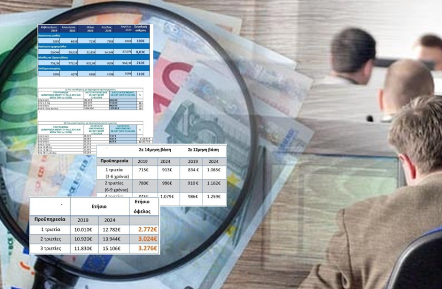 Μετά τις σημερινές ανακοινώσεις όσοι αμείβονται με τον κατώτατο μισθό θα λαμβάνουν 830 ευρώ μικτά ενώ τα «καθαρά» εισοδήματά τους θα ανέρχονται περίπου στα 706 ευρώ για εργαζόμενο χωρίς παιδιά, τριετίες, κλπ. Σήμερα, ο μισθός είναι στα 780 μικτά , δηλαδή στα 667 ευρώ «καθαρά». Πρόκειται λοιπόν για μία μηνιαία αύξηση του μισθού περίπου 40 ευρώ. … Συνεχίστε να διαβάζετε το Κατώτατος μισθός στο μικροσκόπιο: Η αύξηση απέναντι στην ακρίβεια-Συγκρίσεις με την τελευταία τριετία και… 15ετία.