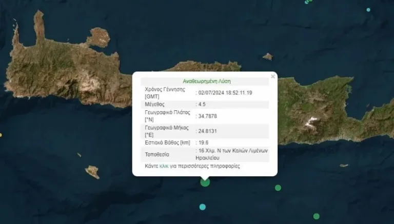 Ισχυρή σεισμική δόνηση σημειώθηκε νότια της Κρήτης της κλίμακας των 4,5 βαθμών Ρίχτερ. Πιο συγκεκριμένα, σύμφωνα με την αναθεωρημένη λύση του Γεωδυναμικού Ινστιτούτου Αθηνών, το επίκεντρο του σεισμού εντοπίζεται 16 χιλιόμετρα νότια των Καλών Λιμένων Ηρακλείου και το εστιακό βάθος υπολογίζεται στα 19,6 χιλιόμετρα.