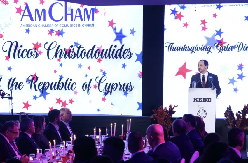 Ο Νίκος Χριστοδουλίδης μετά την τηλεφωνική επικοινωνία με τον Τραμπ, παρέστη στο δείπνο που παρέθεσε το Αμερικανικό Εμπορικό Επιμελητήριο Κύπρου (AmCham), στη Λευκωσία, με την ευκαιρία της Γιορτής των Ευχαριστιών.