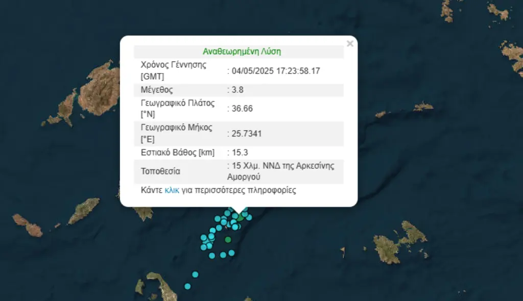 Συγκεκριμένα, πρόκειται για σεισμική δόνηση μεγέθους 4,1 βαθμών της κλίμακας Ρίχτερ, με εστιακό βάθος 13,4 χλμ και 26 χλμ ΑΒΑ της Οίας.