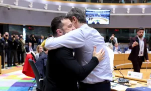 Θερμός εναγκαλισμός Μητσοτάκη-Ζελένσκι στη Σύνοδο Κορυφής στις Βρυξέλλες