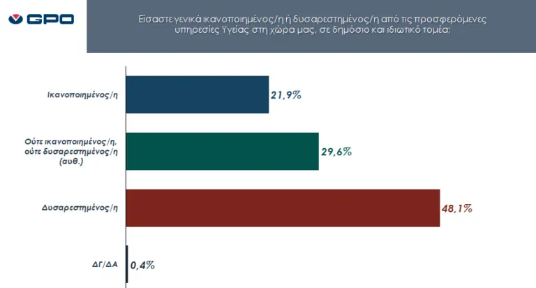 Στο 61,1% ανέρχονται οι δυσαρεστημένοι πολίτες από τις προσφερόμενες υπηρεσίες δημόσιας Υγείας στη χώρα μας, όπως φάνηκε στις απαντήσεις που έδωσαν στο πλαίσιο έρευνας κοινής γνώμης, που διεξάγει ετησίως ο Πανελλήνιος Ιατρικός Σύλλογος, μέσω της εταιρείας GPO, για την ικανοποίηση στο σύστημα Υγείας από πολίτες και ιατρούς. Οι συμμετέχοντες στην έρευνα Στην έρευνα μεταξύ των πολιτών, … Συνεχίστε να διαβάζετε το Έρευνα για την Υγεία: Δυσαρεστημένοι οι πολίτες από την έλλειψη οργάνωσης και προσωπικού – Ικανοποιημένοι από τους γιατρούς.