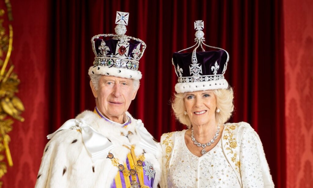 Το πορτρέτο του βασιλιά Καρόλου δείχνει να φορά τον επίσημο μανδύα της στέψης μαζί με τη ναυτική του στολή και να στέκεται πλάι στο Αυτοκρατορικό Στέμμα. Η βασίλισσα Καμίλα απεικονίζεται ντυμένη με το φόρεμα της στέψης το οποίο είναι σχεδιασμένο από τον Μπρους Όλντφιλντ (Bruce Oldfield).