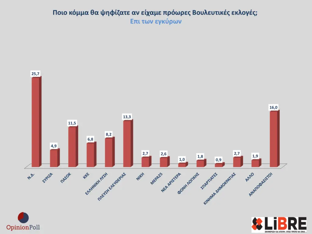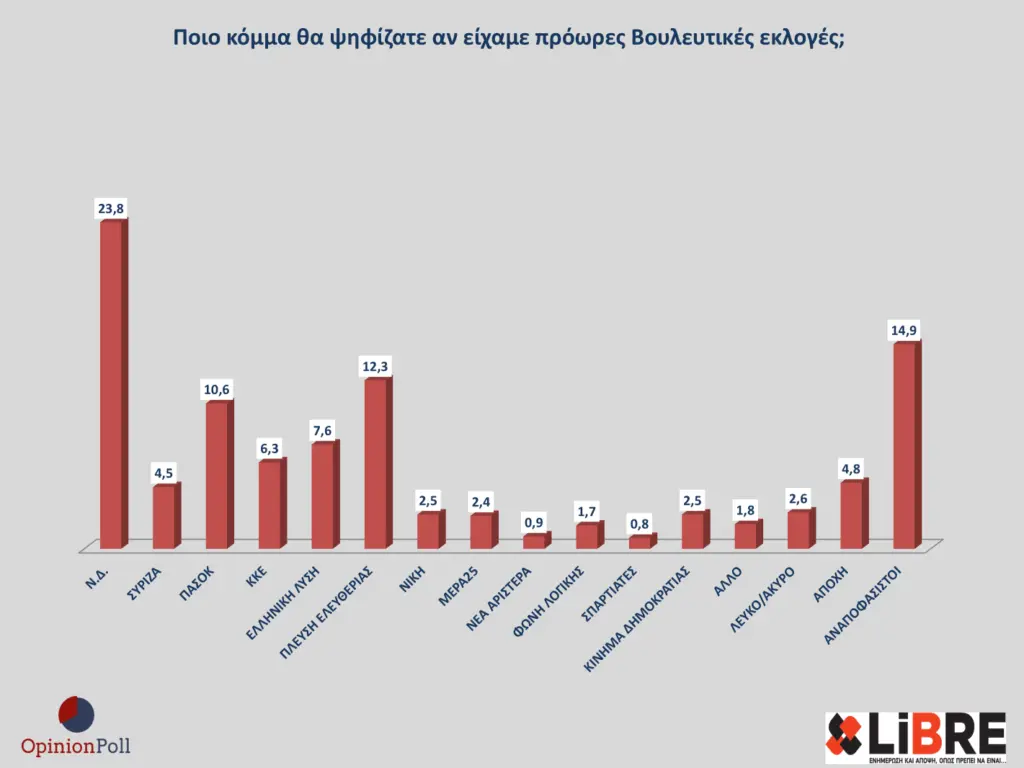 OPINION POLL για το libre: Επιβεβαιώνεται η άνοδος της ΝΔ, δεύτερη Πλεύση Ελευθερίας, τρίτο ΠΑΣΟΚ