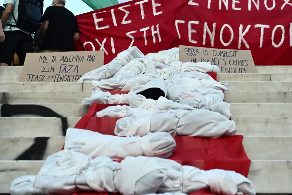 Πλήθος κόσμου συγκεντρώθηκε στην πλατεία Συντάγματος, με τους διαδηλωτές να προχωρούν σε μία συμβολική κίνηση και να τοποθετούν στα σκαλιά “σορούς ανθρώπων” πάνω σε ένα κόκκινο “ποτάμι αίματος”, ενώ πίσω ένα πανό έγραφε “Είστε συνένοχοι, όχι στη γενοκτονία“.